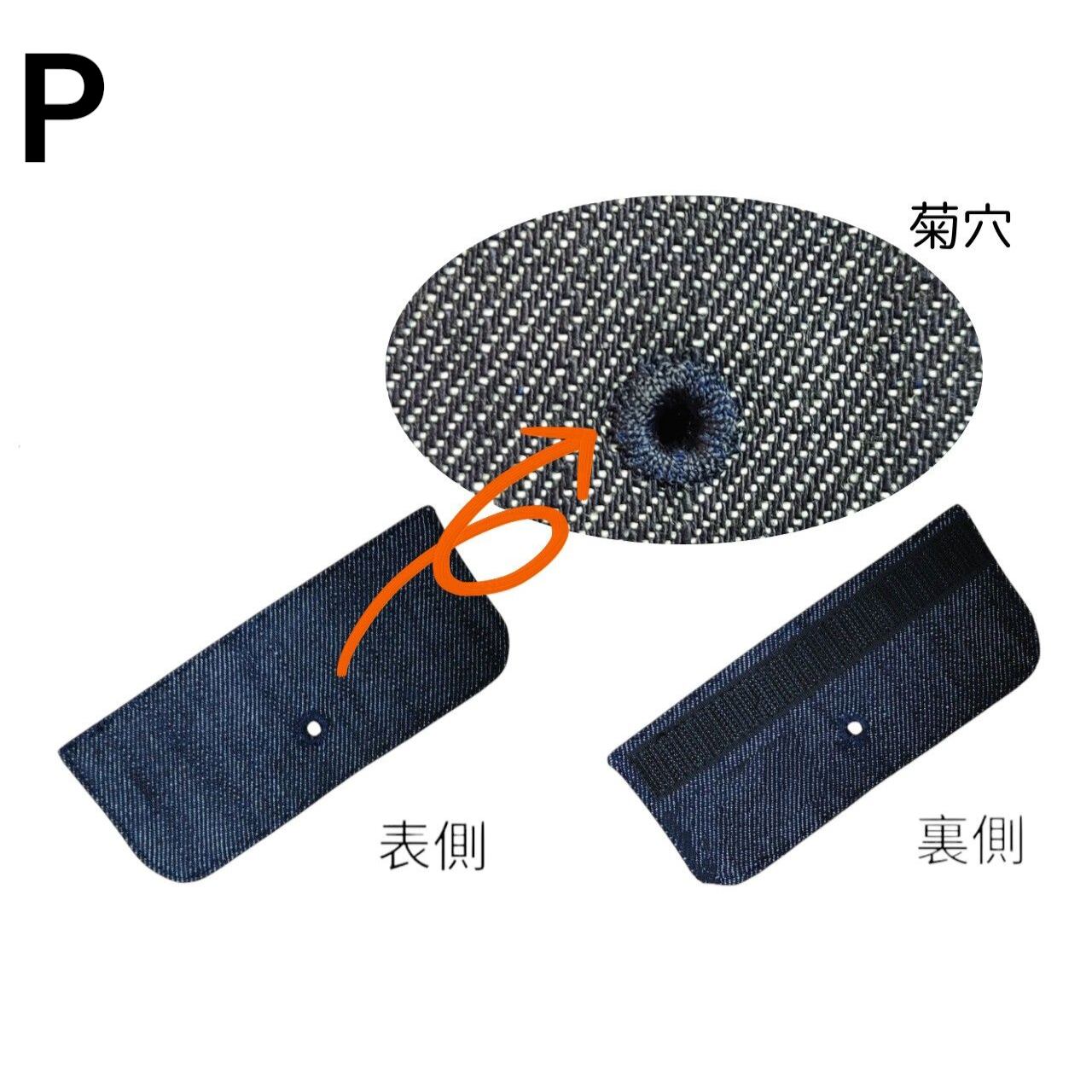 ★P・・・釦を取り外した状態のフラップです。真ん中には菊穴が施されています