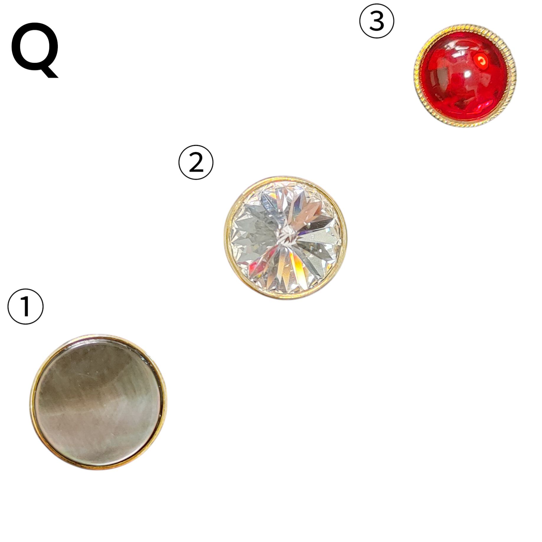 ★Q・・・フラップに装着する釦です。この3個を1セットとして洋服本体と一緒にお届けします ①黒蝶貝(16mm)→見る角度によっていろいろな光を放ちます。プラスチック製のボタンにはない、天然素材ならではの独特な輝きが魅力です ②クリスタル15mm→まるで宝石のようにカッティングされたクリスタルガラス釦です。とにかくキラッキラです! ③スワロフスキー・カボション13mm シャム色(深い赤)→丸いドーム型のガラス釦です。表面がつるりとしていてとてもかわいらしく光沢も抜群で、素朴な味わいがあります