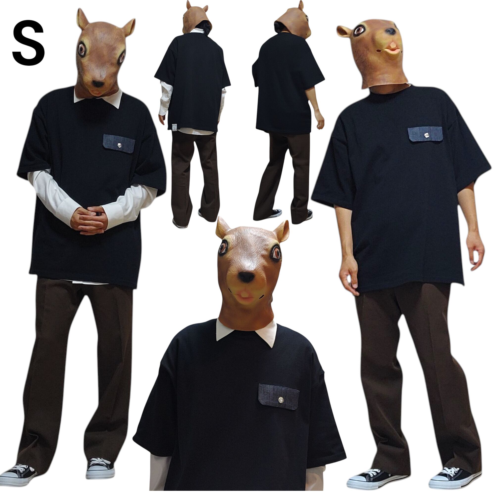 ★S・・・Tシャツを使ったメンズコーデです。XLサイズを着用しています(リスの体型は身長170cmの中肉です)。大きめシルエットのTシャツなので、夏以外は中にシャツやロンTなどを着てみるのもオススメです